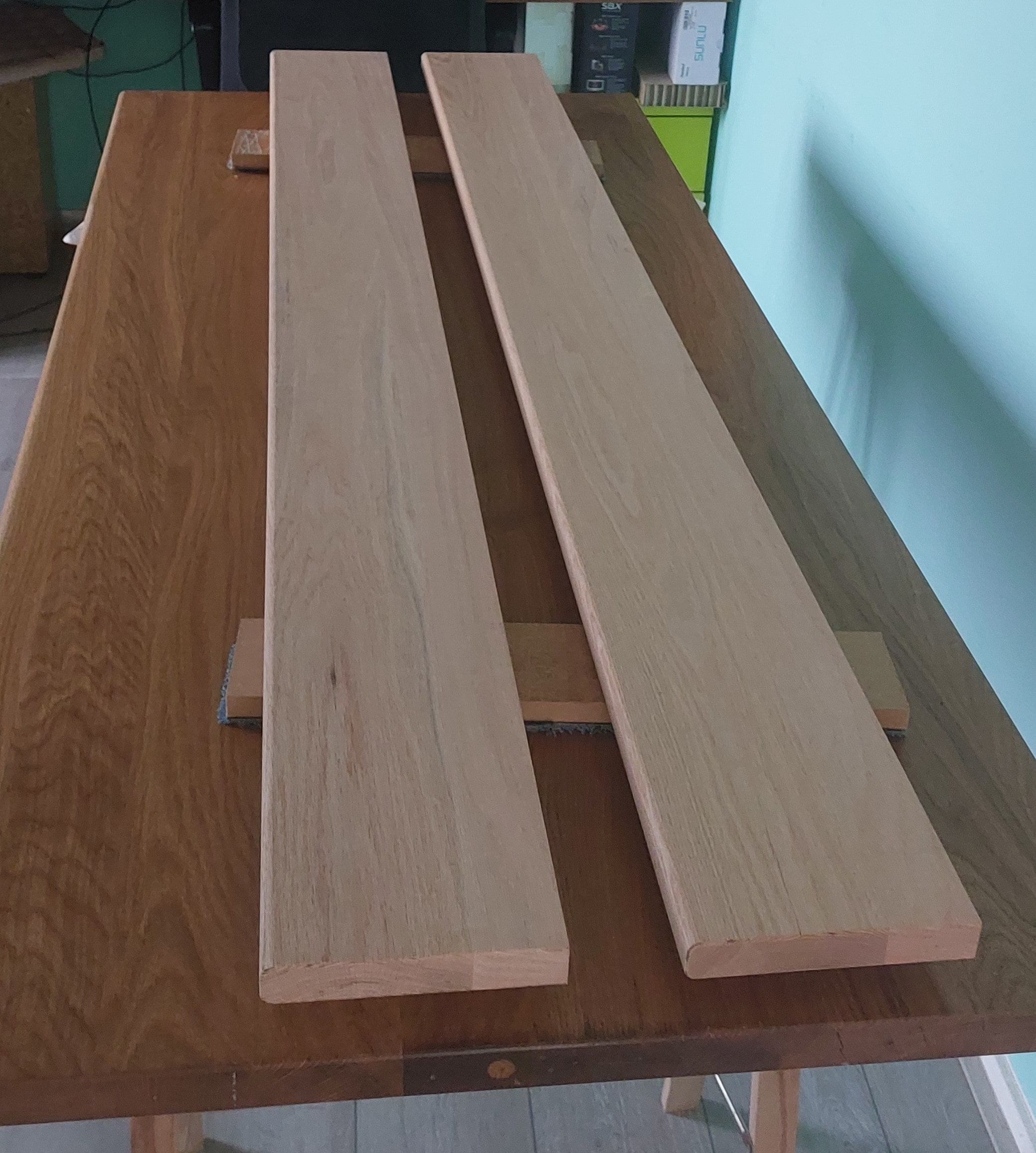 Ik heb hout van verschillende kastdelen hergebruikt om een bureaublad en wat wandplanken te maken van eiken die ik daarna af heb gewerkt met osmo olie .