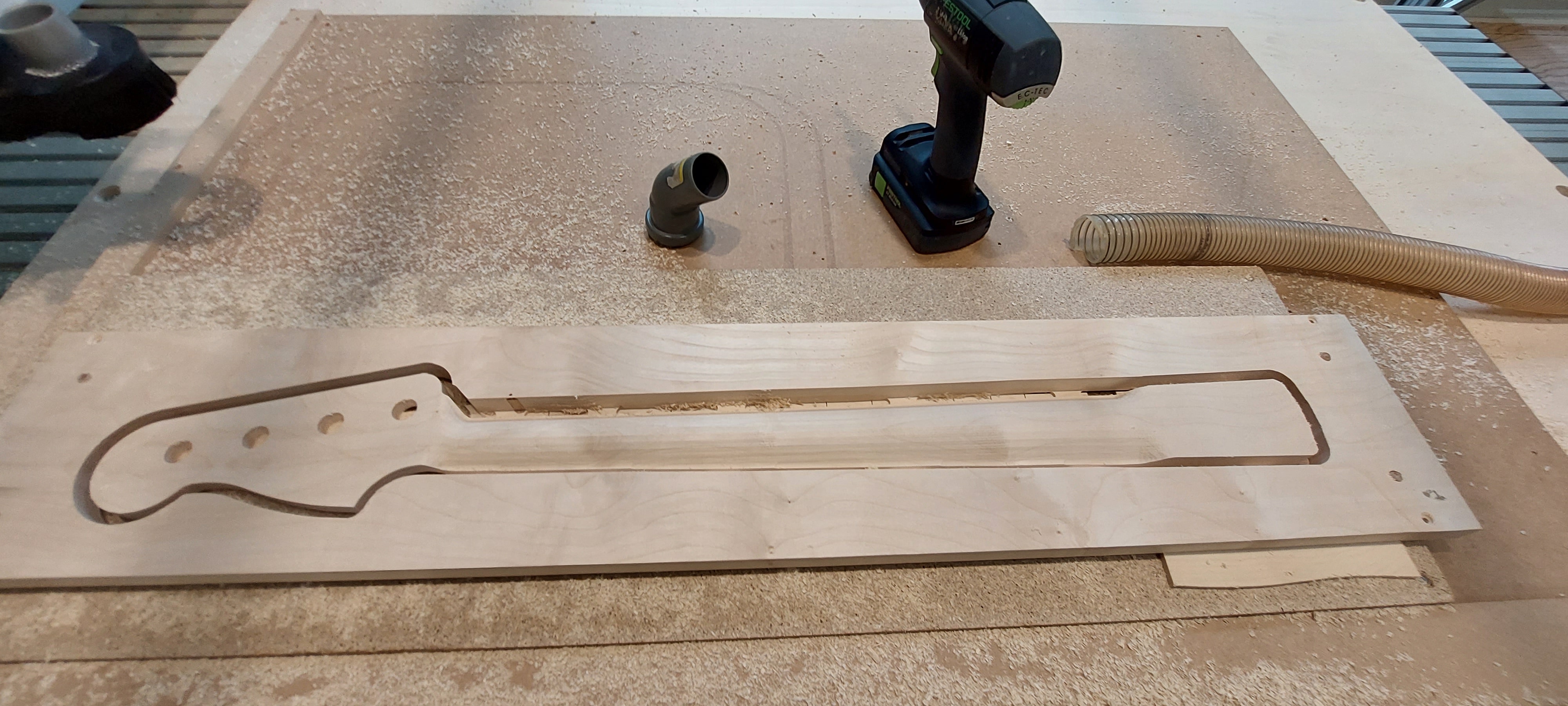 Deze presicion bass was mijn eerste gitaar die ik heb uitgefreesd op de cnc en ook mijn eerste dubbelzijdige cnc bewerking. Het freesen van dit ontwerp op de cnc in handing want de bellycut komt dan erg mooi uit en de radius bij de neckpocket is gelijk heel strak gevormd.