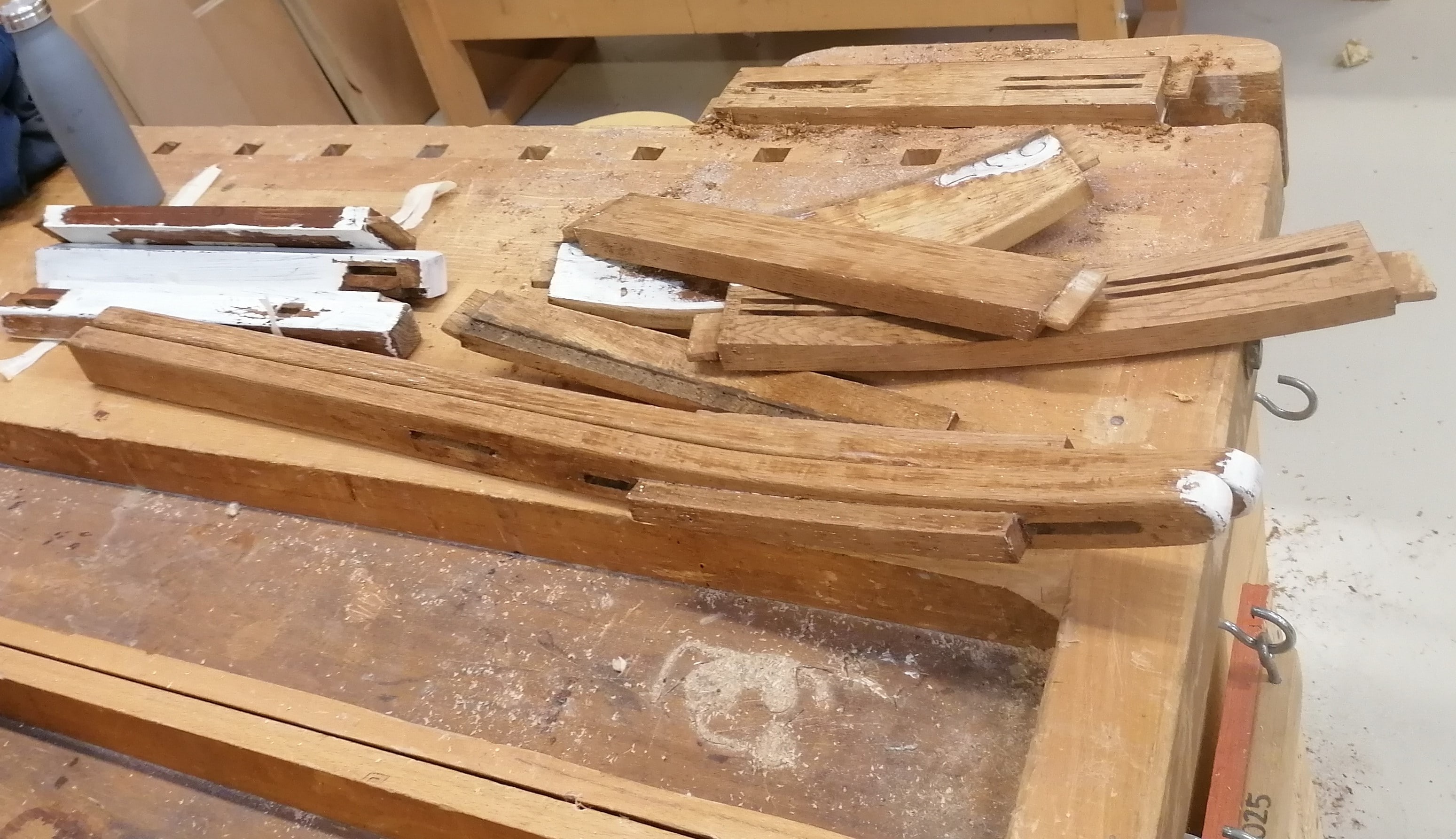 Sommige onderdelen van de stoel waren gebroken of miste compleet. Dus die onderdelen heb ik gerepareerd of compleet vervangen. Hier is een regel te zien waar twee sleuven in gefreesd zijn, waarin een plankje geplaatst kan worden die de zitting draagt. Helaas was het middenstuk tussen die twee sleuven uitgebroken dit ik heb die er uit gehakt en vervangen met een nieuw stukje hout. Verder heb ik ook nog een regel onderin de stoel vervangen.