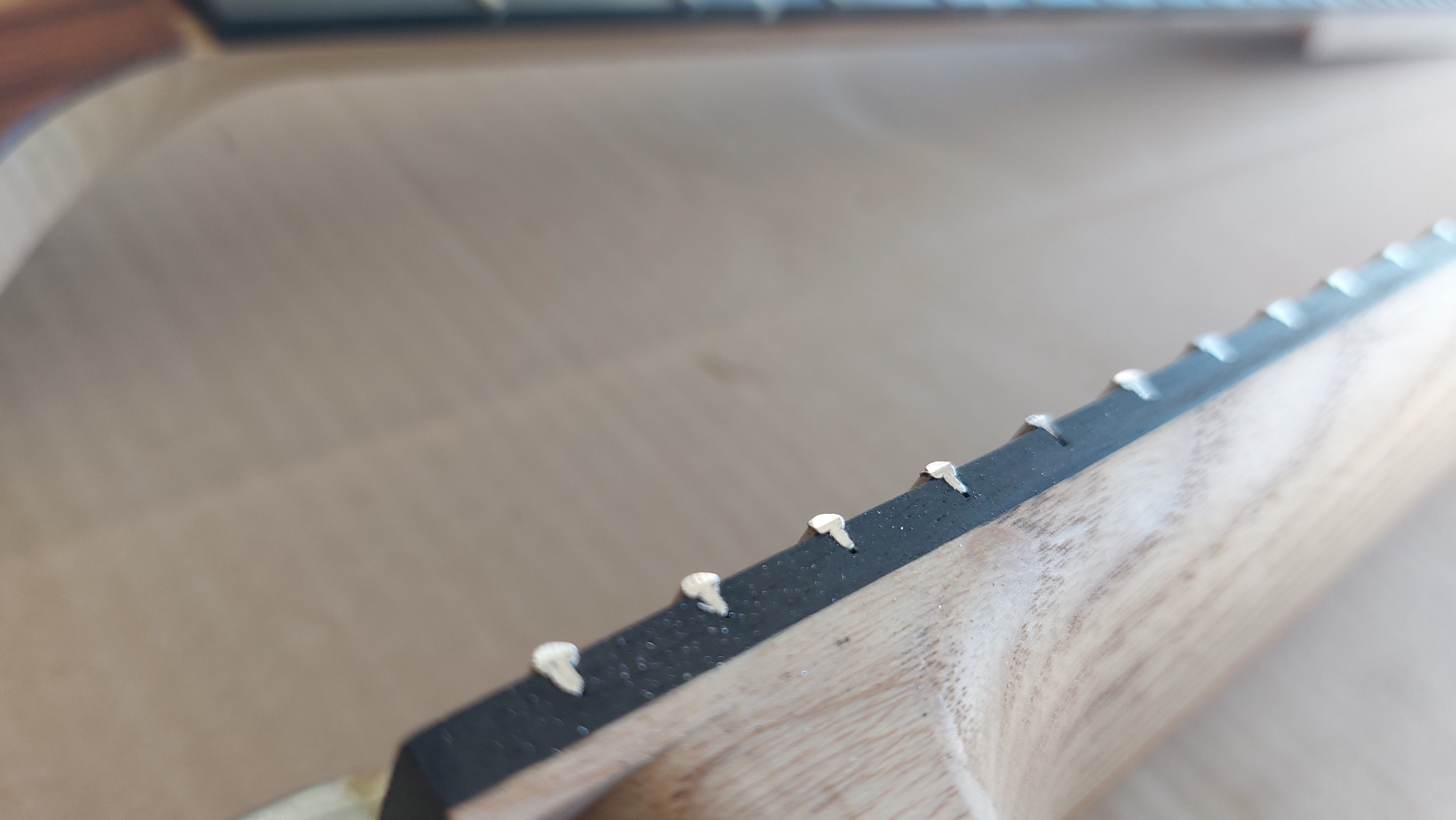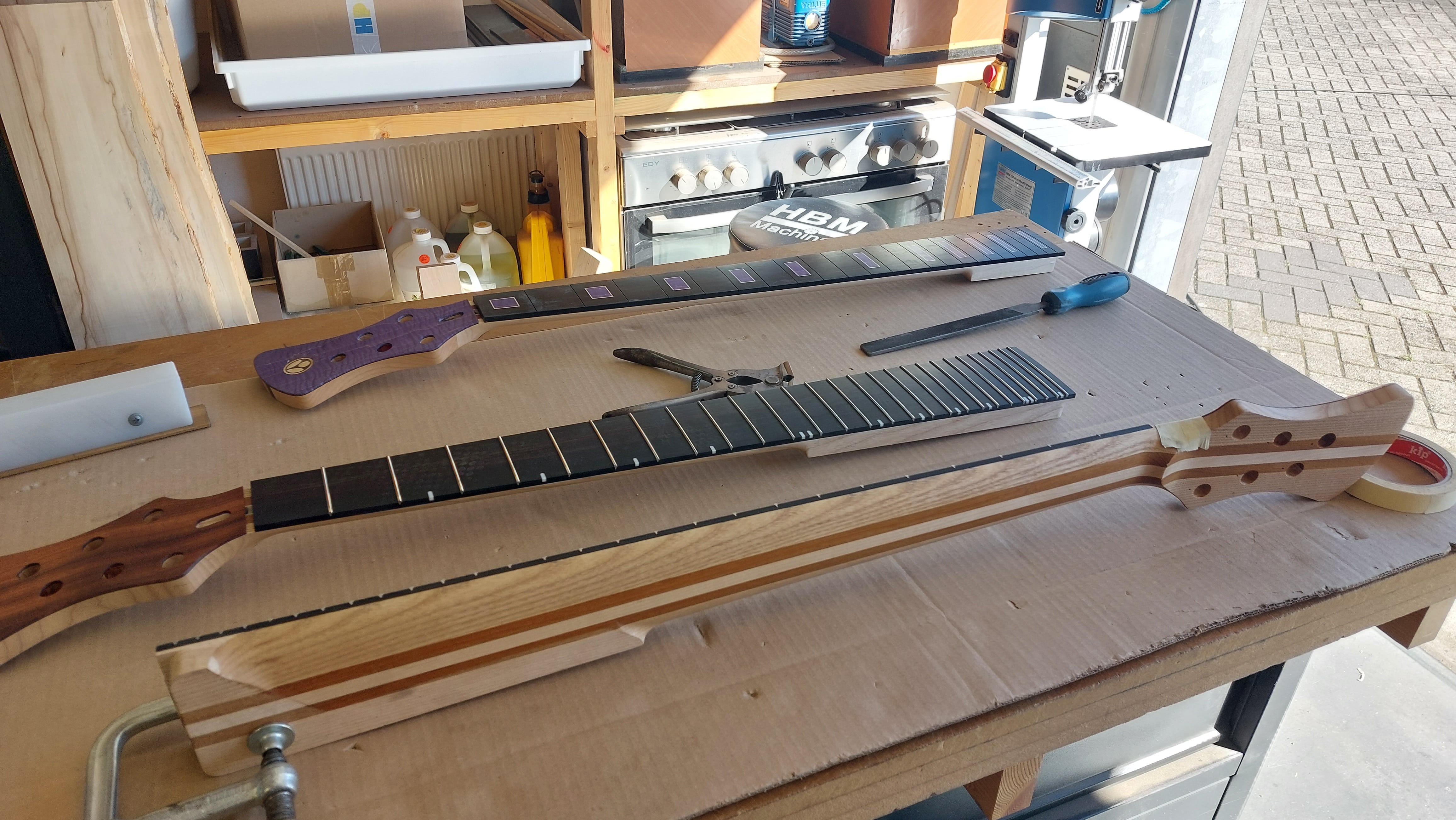 Verder heb ik bij Adamovich vooral fretwerk en schuurwerk gedaan. Zoals de bodies en necken op schuren naar 400 grit of de fretten gelijk veilen met de zijkant van de hals. Ook heb ik het fineer geknipt voor tussen de bodies en daarna die bodies verlijmt.